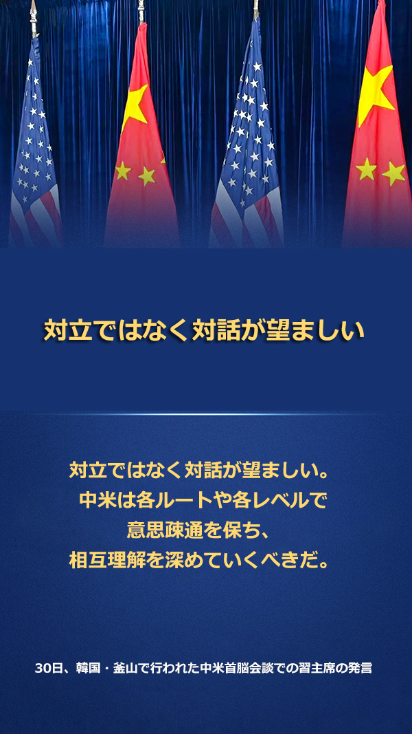 習近平国家主席は30日、韓国・釜山で米国のトランプ大統領と会談した。この会談で、習主席の言葉は力強く響いた。ここでは、同会談での習主席の言葉を紹介する。