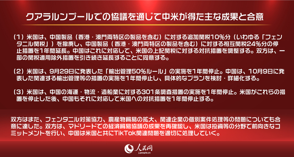 (1)米国は、中国製品(香港特別行政区及び澳門<マカオ>特別行政区の製品を含む)に対する追加関税10%分(いわゆる「フェンタニル関税」)を撤廃し、中国製品(香港特区及び澳門特区の製品を含む)に対する相互関税24%分の停止措置を1年間延長する。中国はこれに対応して、米国の上記関税に対する対抗措置を調整する。双方は、一部の関税適用除外措置を引き続き延長することに同意する。