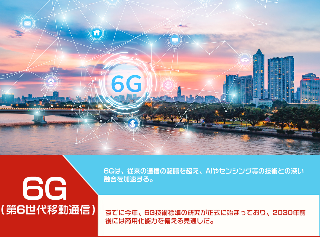 5Gと比べると、6Gは単なる伝送速度の向上にとどまらず、通信とワイヤレスセンシング、先進的コンピューティング、人工知能(AI)などの技術を一体化した「モバイル情報ネットワーク」となる。5Gが「IoE(万物のインターネット)」に重点を置いたのに対し、6Gはこれらの技術を領域を跨いで融合した「AIoT(モノの人工知能)」の実現を強調する。