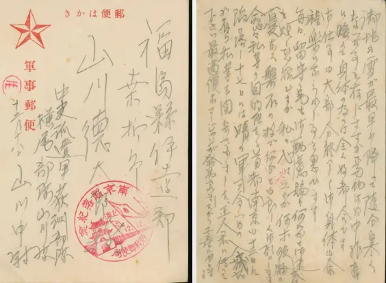 1点目は、中国侵略日本軍中尉・山川儀仁が1937年12月18日に福島県の山川徳太郎宛に送った戦地からの手紙だ。はがきの表には「南京陥落記念」の消印が鮮明に押されている。裏面には「……私達の目的地である首都南京が13日に陥落し、17日には軍司令官の入城式が有り、私達は閲兵されました。正人君に伝えてください。最高価なマージャンが発見されたから特産品として送ります」といった内容が記されている。