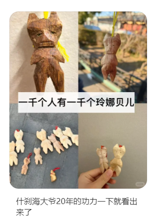 あるネットユーザーがアップしているショート動画を見ると、その作品は確かにとても抽象的で、目鼻も耳もあり、手足も揃っているが、何をモチーフにしているのか分からない。また、各種動物をモチーフにした木彫りも、教えてもらわなければ、何の動物がさっぱり分からない。ただ購入した人は「全く似ていないけど、すごく感じるものがある」と話す。そして、「イヌかと聞くと、おじさんからは、ネコという答えが返ってくるし、ウサギかと思ったら、クマだった。それに、他の人が見ると何なのか分からないが、おじさんは全て確かに何かをモチーフにしている。おじさんが、木彫りにスピリットと意義を吹き込んでいるかのようだ」と語る。