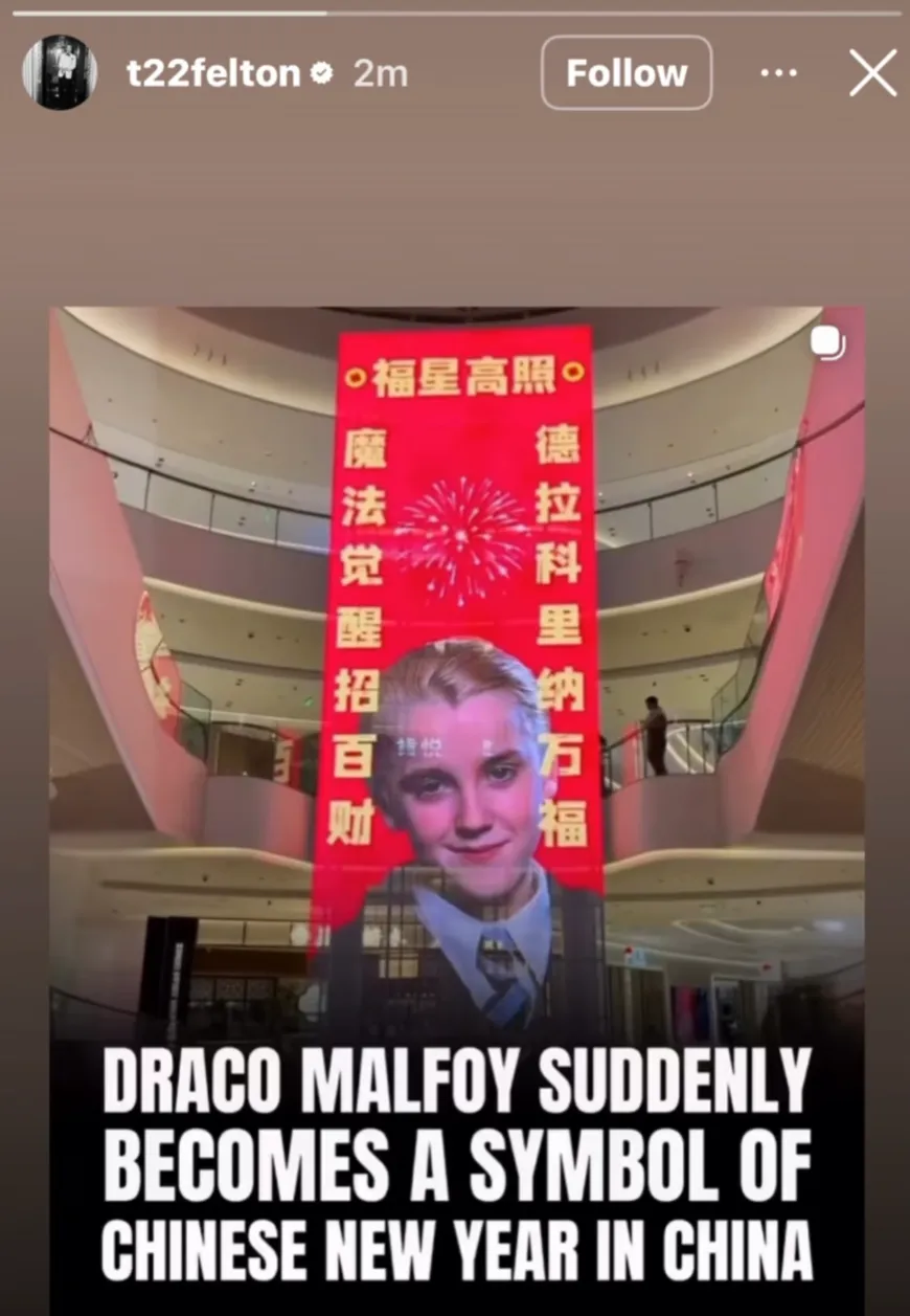 ハリー・ポッターの映画シリーズでマルフォイ役を演じてきたトム・フェルトンもソーシャルメディアで、中国のショッピングモールのアトリウムに自身が演じたマルフォイが大きくデザインされ、「万福」や「魔法でお金を招き入れる」ことを願う中国語が書かれた巨大なポスターに「いいね」を寄せた。