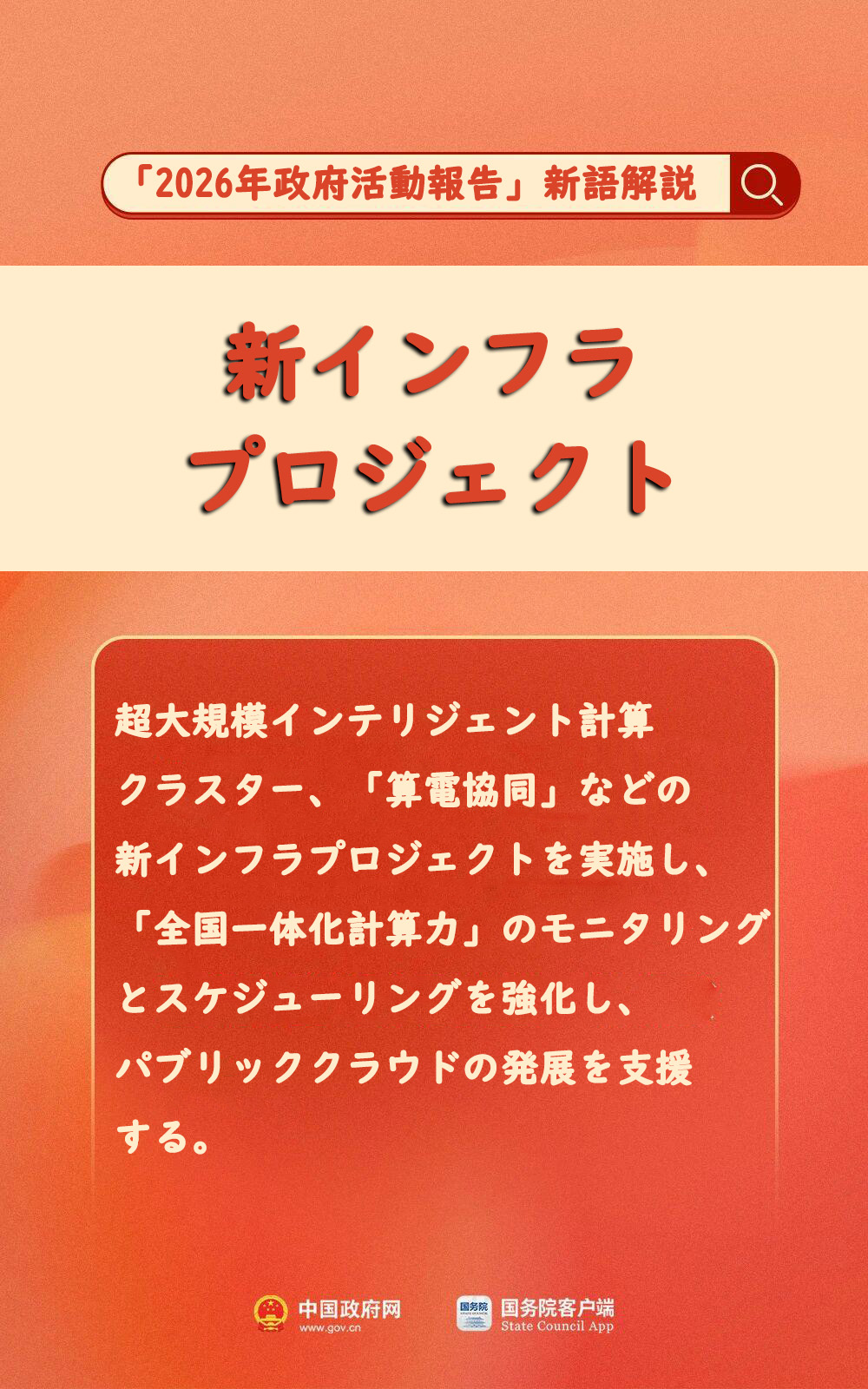 超大規模インテリジェント計算クラスター、「算電協同」などの新インフラプロジェクトを実施し、「全国一体化計算力」のモニタリングとスケジューリングを強化し、パブリッククラウドの発展を支援する。