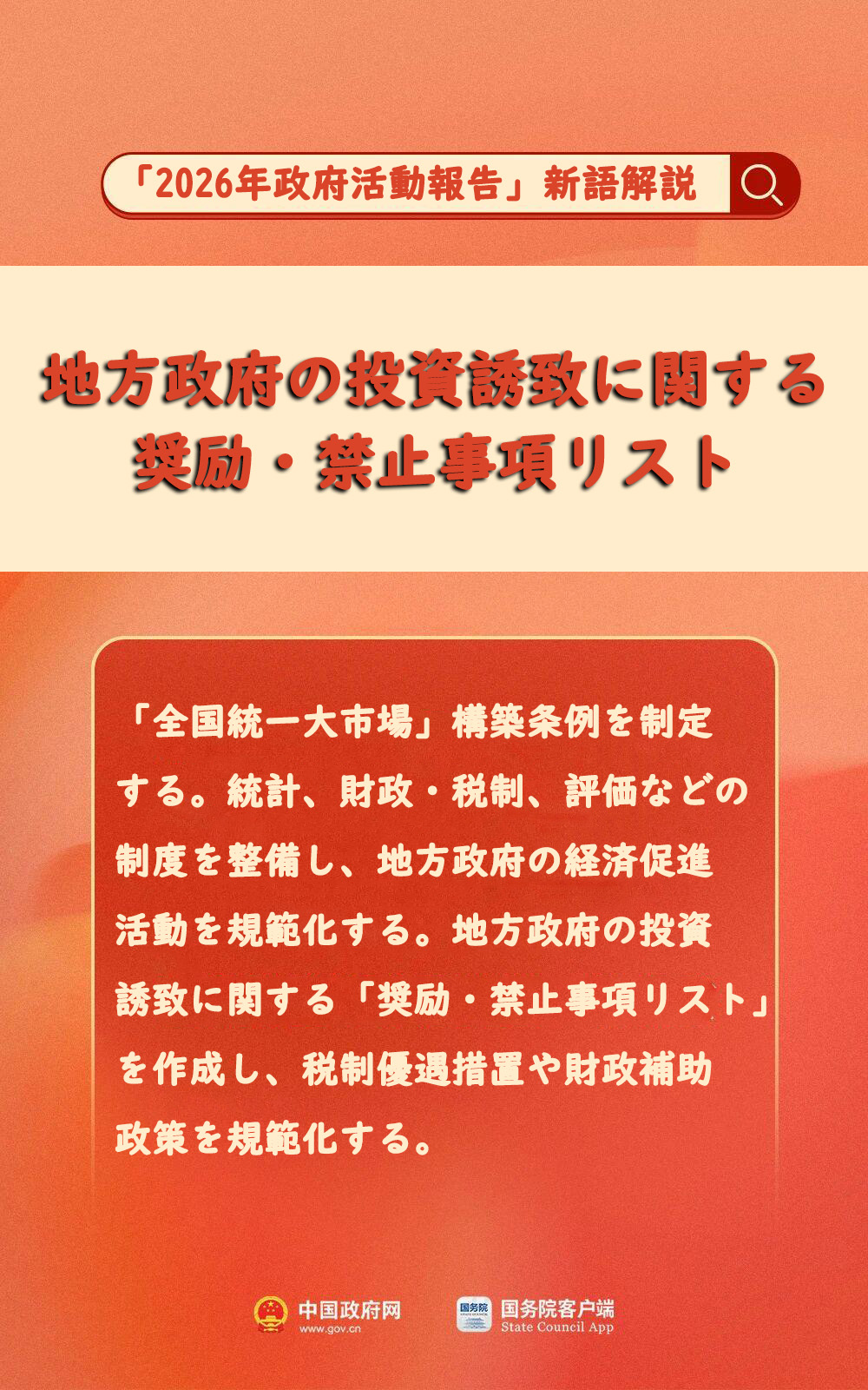 「全国統一大市場」構築条例を制定する。統計、財政・税制、評価などの制度を整備し、地方政府の経済促進活動を規範化する。地方政府の投資誘致に関する「奨励・禁止事項リスト」を作成し、税制優遇措置や財政補助政策を規範化する。