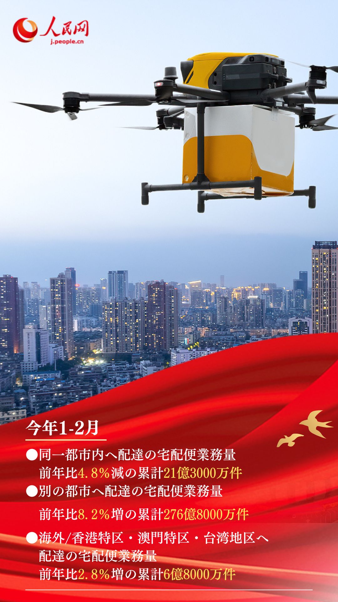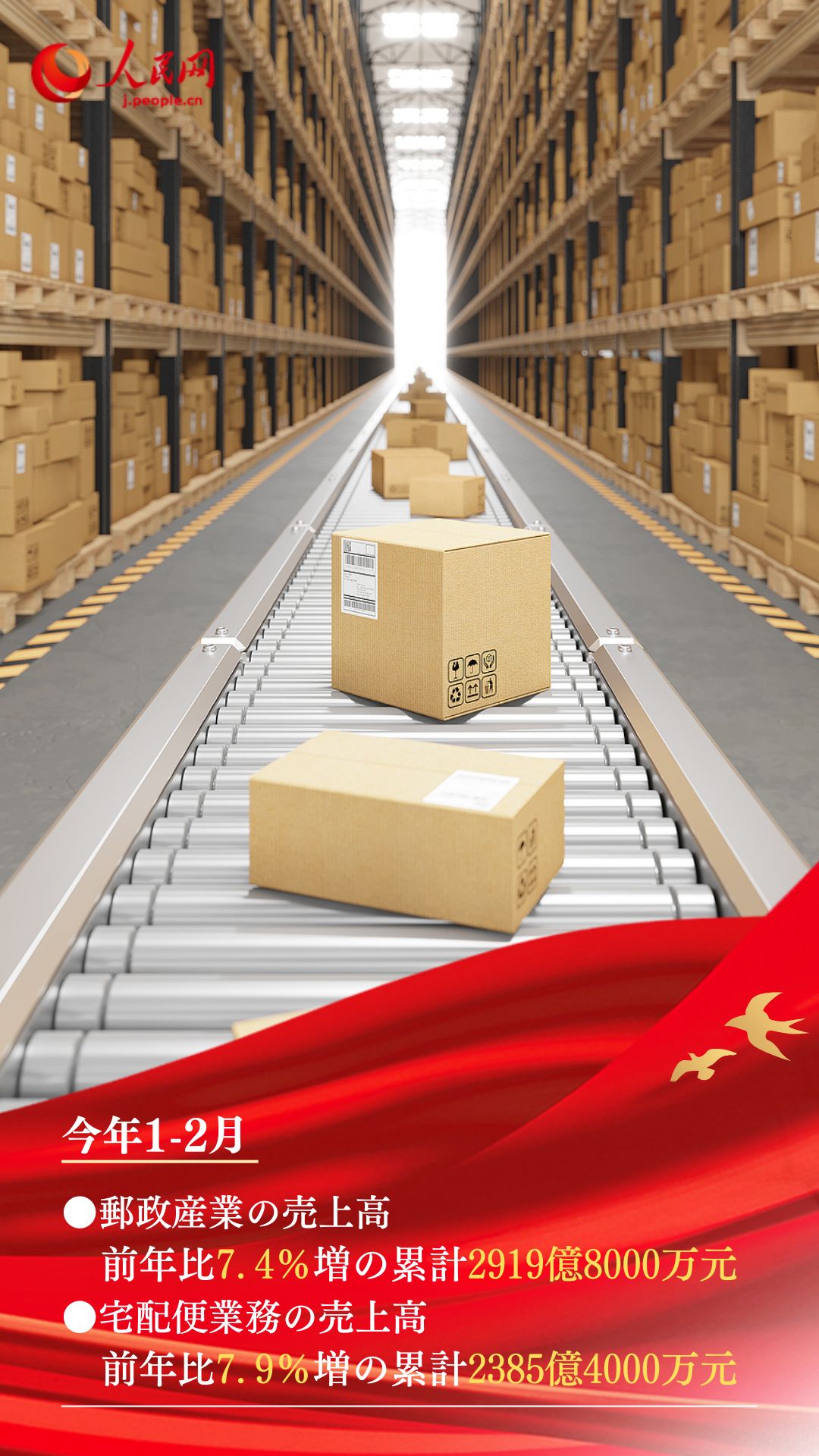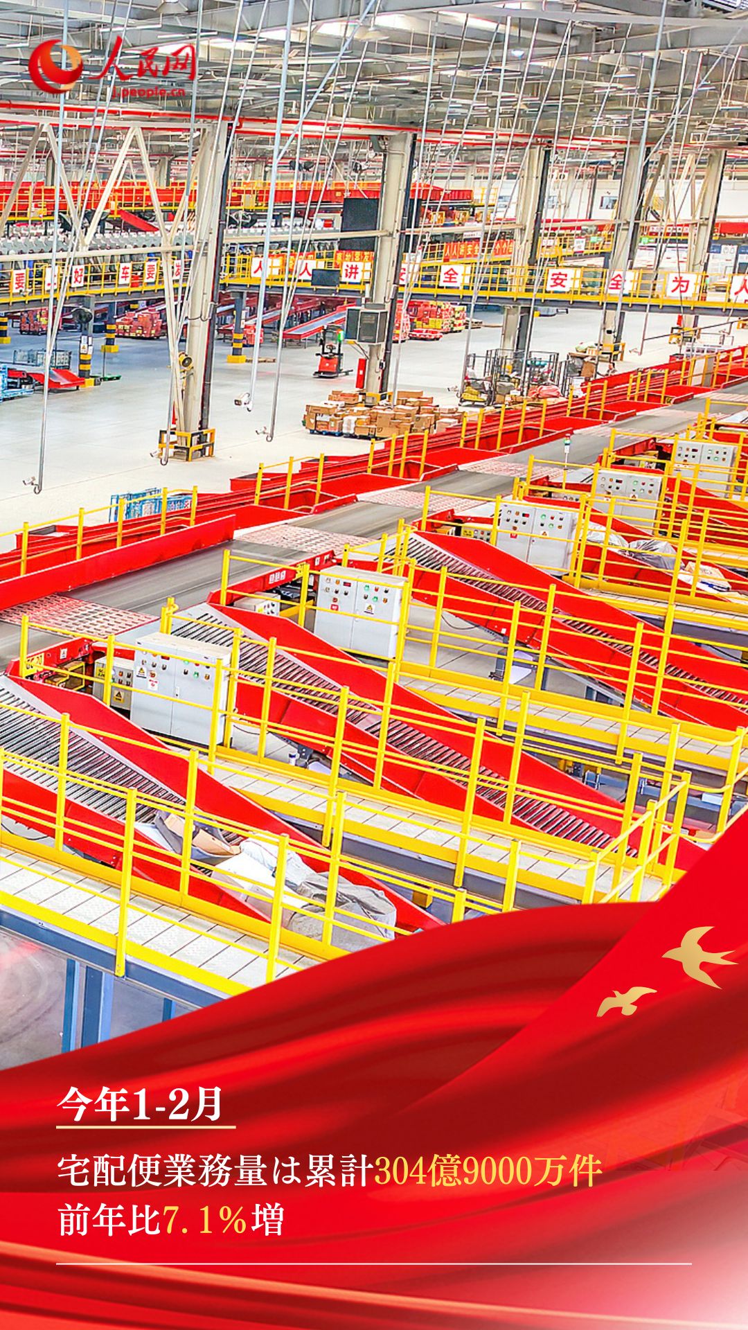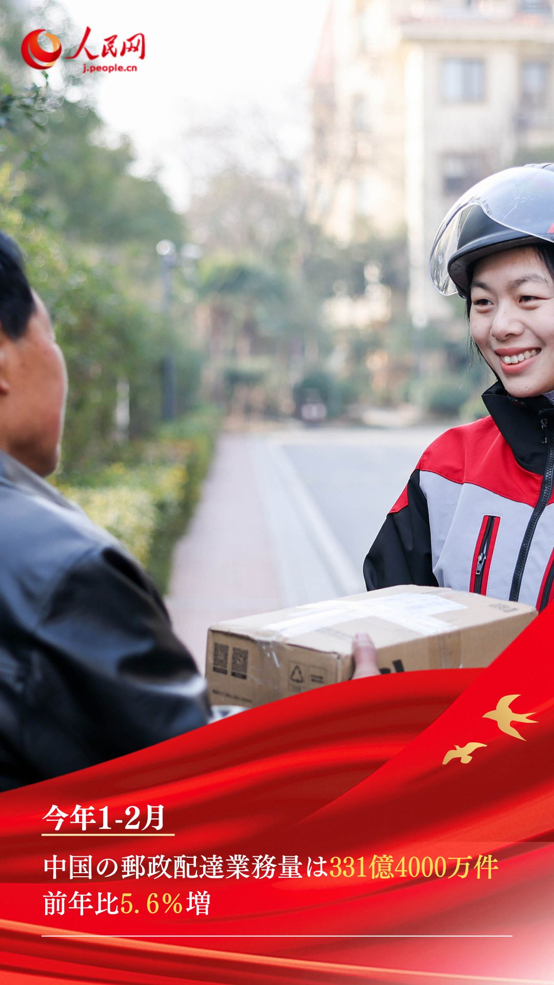 国家郵政局は3月20日、2026年1-2月の郵政産業の状況を発表した。それによると、同期の配達業務量は前年同期比5.6%増の累計331億4000万件に上り、そのうち宅配便業務量は同7.1%増の累計304億9000万件に達した。