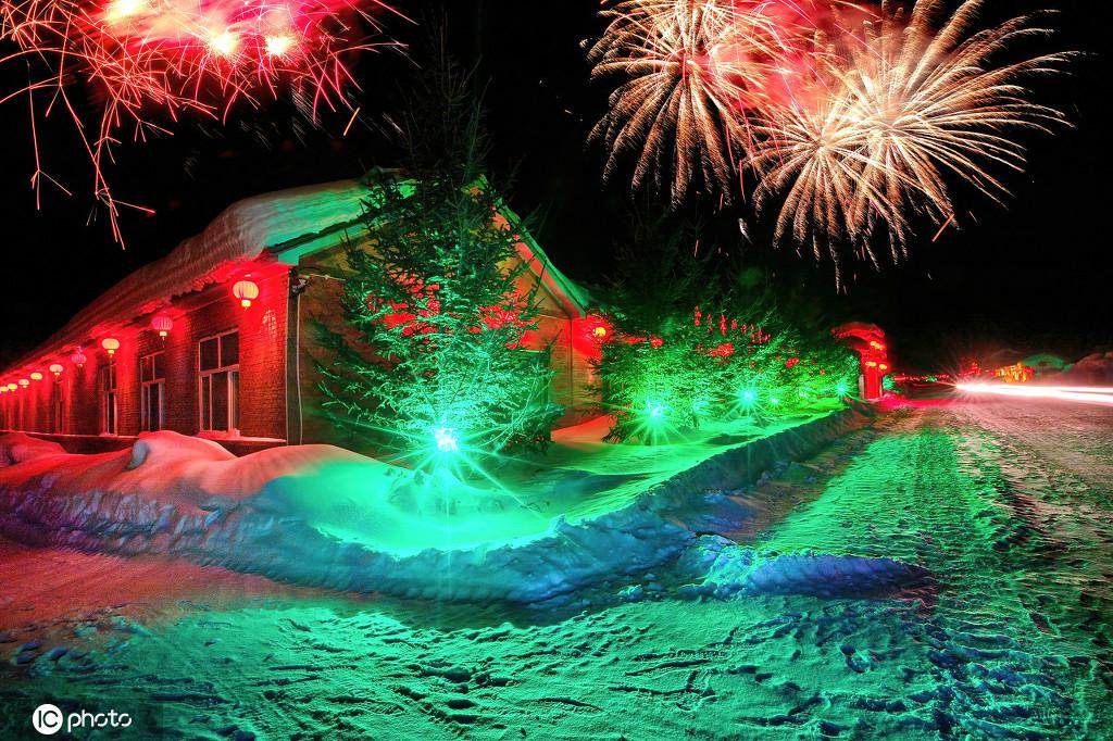 まるで童話の世界!木の小屋と雪のコラボが「雪郷」の夜景彩る 黒竜江省