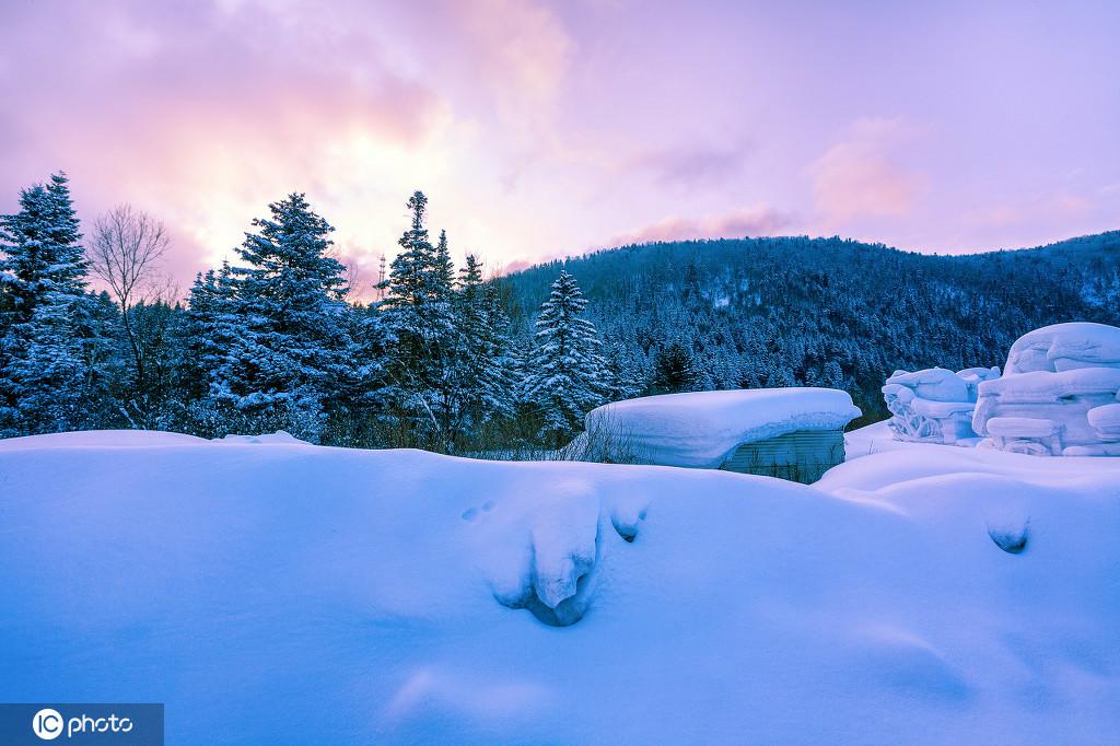 まるで童話の世界!木の小屋と雪のコラボが「雪郷」の夜景彩る 黒竜江省