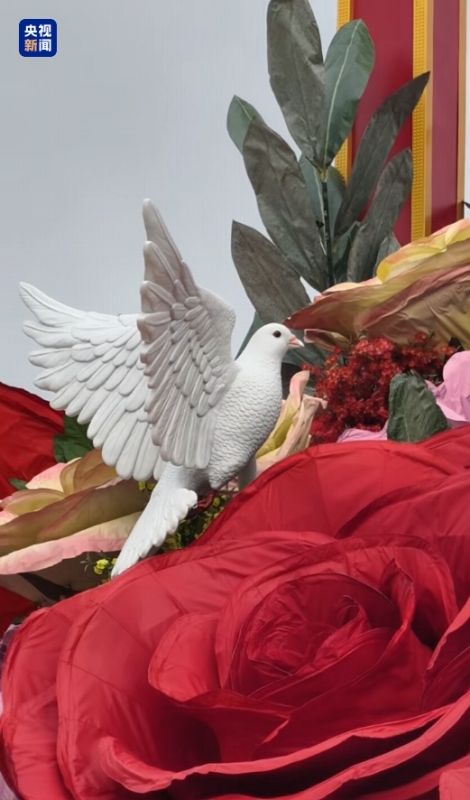 花かごには、むつまじく楽しい暮らしを意味するハスの花や、平和と希望を意味するコウシンバラ、栄光と平和を意味するオリーブの枝、自由と幸福を意味するヒマワリ、勇敢さを意味するキワタといった、様々な縁起の良い意味が込められた草花が飾られているほか、平和を意味するハトも添えられ、「平和な発展と活力ある繁栄」を体現すると共に、祖国の繁栄と富強を祝し、世界平和と発展を願う思いを表現している。(編集KN)