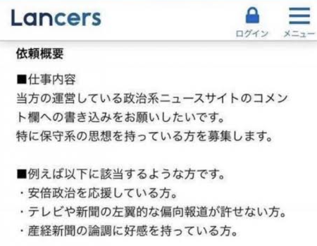 クラウドワークスは決して特殊なケースではない。日本の別の大手クラウドソーシング・プラットフォームであるランサーズでも、過去に同様の募集情報が掲載された。これらの情報は保守派の運営する政治系ニュースサイトのコメント欄への書き込みを求めるものであり、「(元首相の)安倍(晋三)政治を応援している方」「テレビや新聞の左翼的な偏向報道を許せない方」「産経新聞の論調に好感を持っている方」などが応募の条件とされていた。