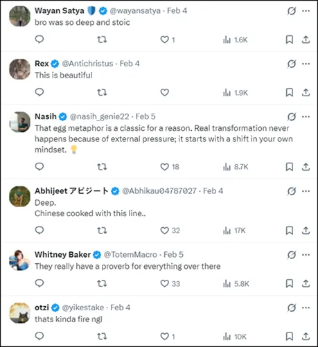 あるユーザーは「変化は自分から始まる」とコメントし、中国のネットで流行しているフレーズ、「卵は外側から割れば食べ物だが、内側から割れば新たな命だ」を引用した。このフレーズは米国人の心を揺さぶり、「この比喩は実に的を得ている」や「なんて不思議な古典の知恵なのか」と感嘆の声を上げた。