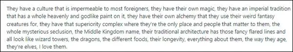 しかしエルフと言う言葉から想像されるのは、白い肌で鼻筋の通った西洋的な顔立ちの神話上の存在であり、中国人とは全く関係がなさそうだ。しかし米国人によると、中国には神話に出てくるエルフのように、独特の文化と悠久の伝統(中国の歴史)があり、龍や神秘的な動物(パンダ)を好み、健康的な食事(中国料理)を食べているということらしい。